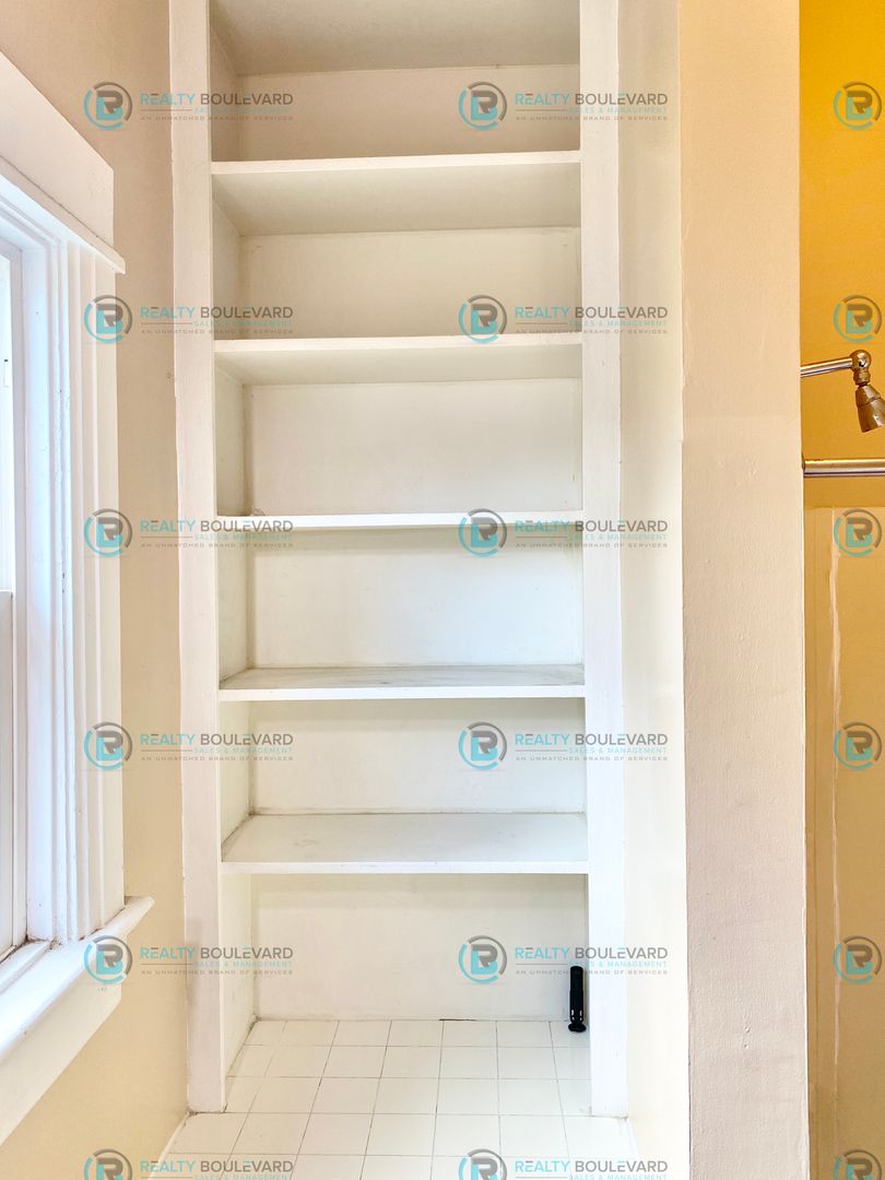 Tucked away for privacy, the bedroom is generously sized and features plush carpeting underfoot, a beautiful bay window that adds architectural interest, and a large closet. The bathroom is just as spacious, with a tub-shower combo, built-in shelving for extra storage, and a window above the sink that invites in soft, natural light.