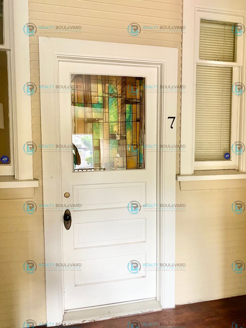 From the moment you approach the building, you're welcomed by a beautifully detailed front door featuring stained glass—just a hint of the character that lies within. Inside, the apartment opens to a bright, airy space with soaring ceilings and original hardwood-style flooring that flows through the living and dining areas. Oversized picture-frame windows bathe the home in natural light, especially with its desirable south-facing orientation.